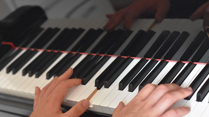 Vores organist René Bak sidder ved flyglet og spiller lige hvad man måtte ønske sig at synge.